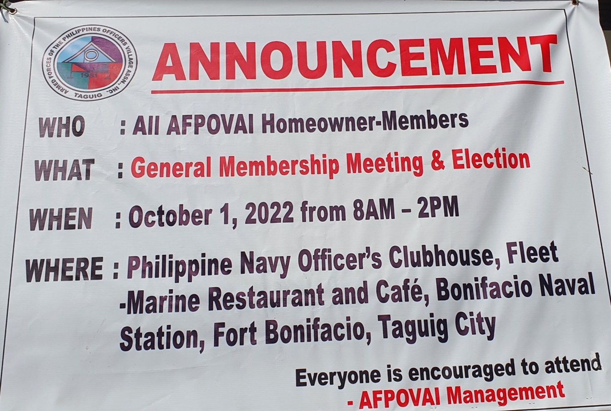 AFPOVAI is open to accept your annual dues payt until 10am OCT 1,2022.